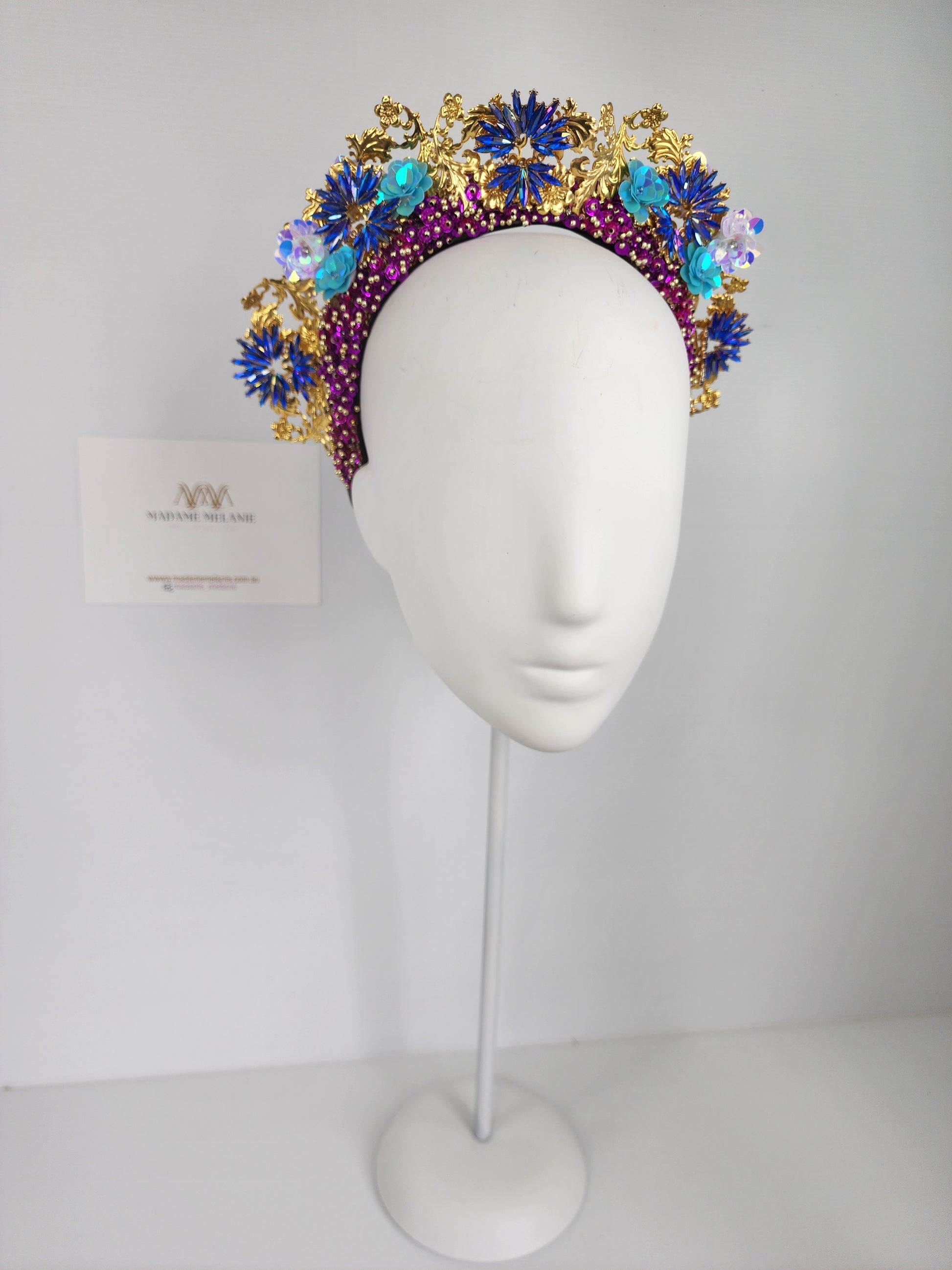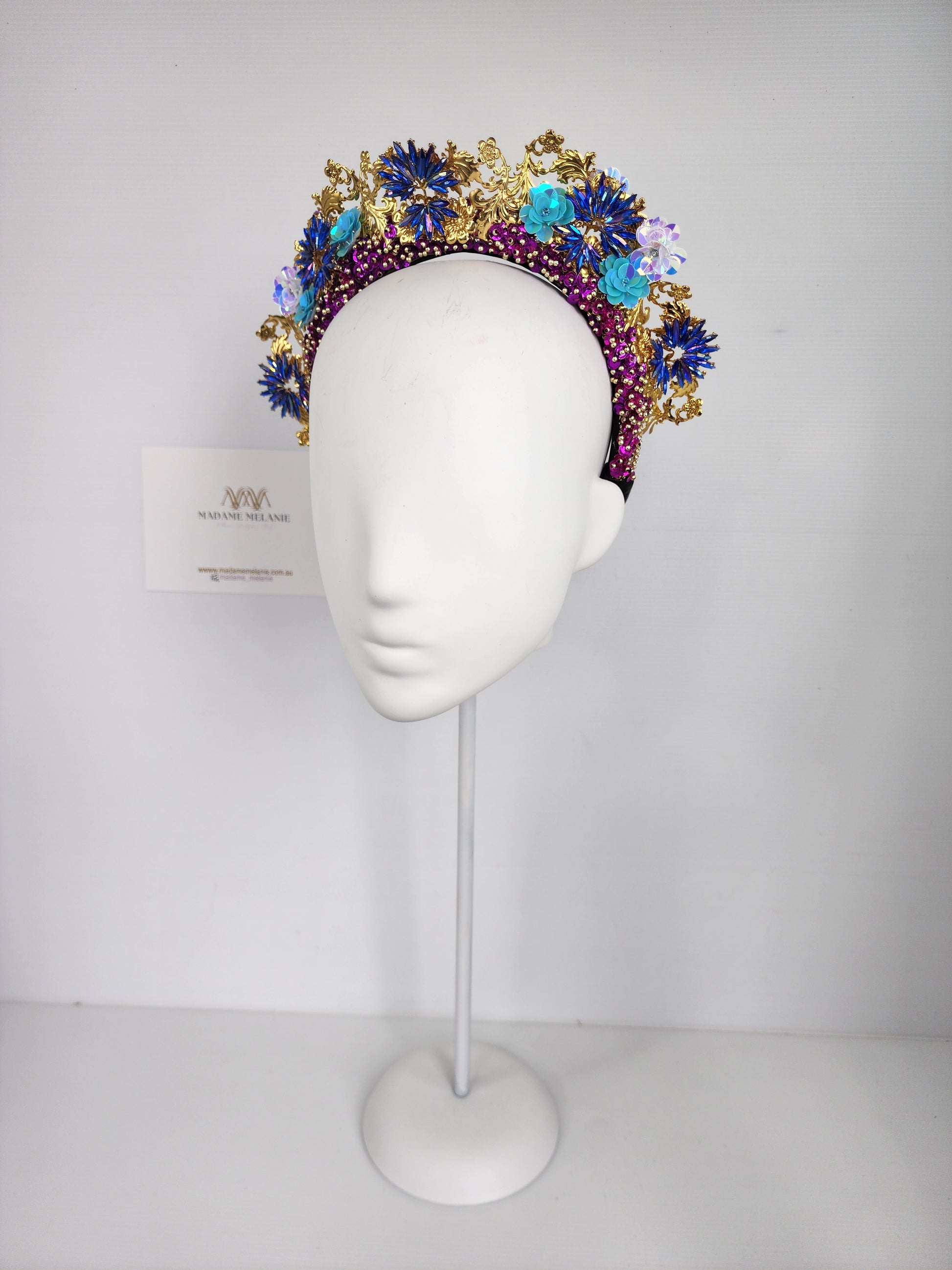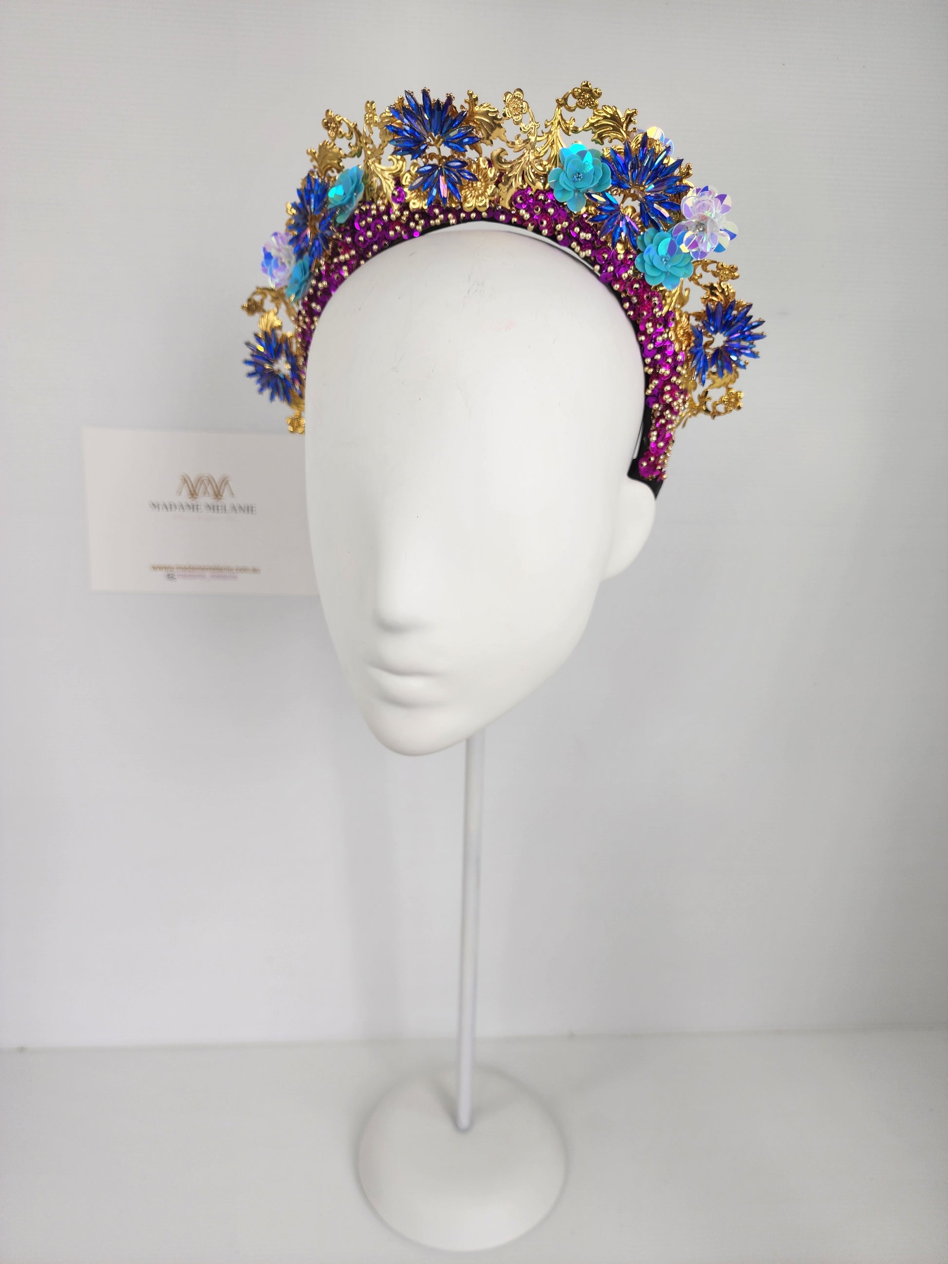 Kiss Me Like a Stranger is a royalty-inspired crown, handsewn with exquisite sequins and gold filigree, adorned with sparkling crystals. Its rich, vibrant colors add a touch of elegance to any outfit. Made in Australia by Madame
