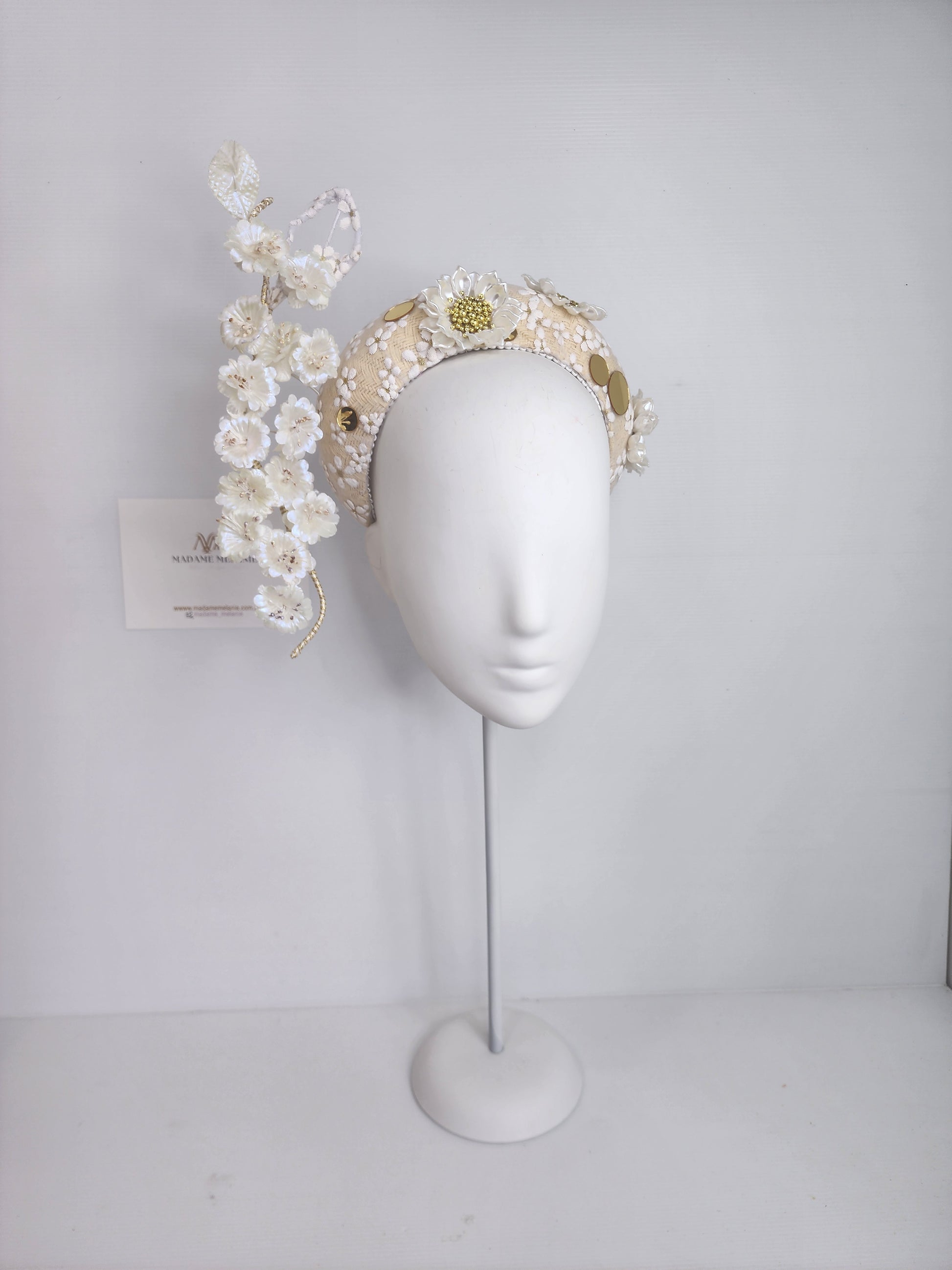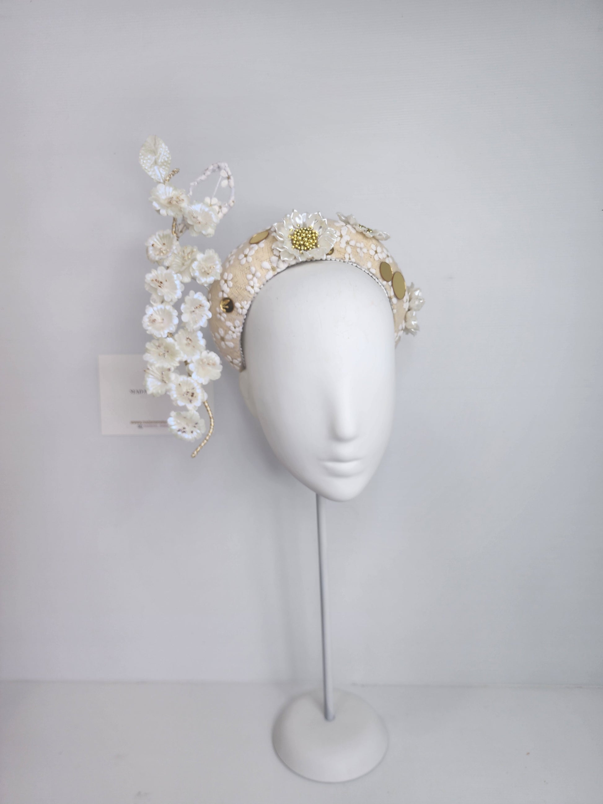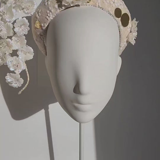 Mirrored Echoes features a hand blocked bandeau base, adorned with iridescent flowers and polka dot mirrors for a unique and eye-catching design. Perfect for adding a touch of shimmer and style to any outfit.