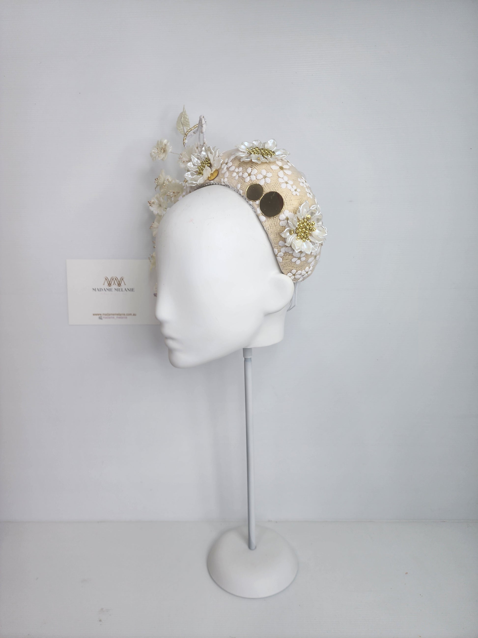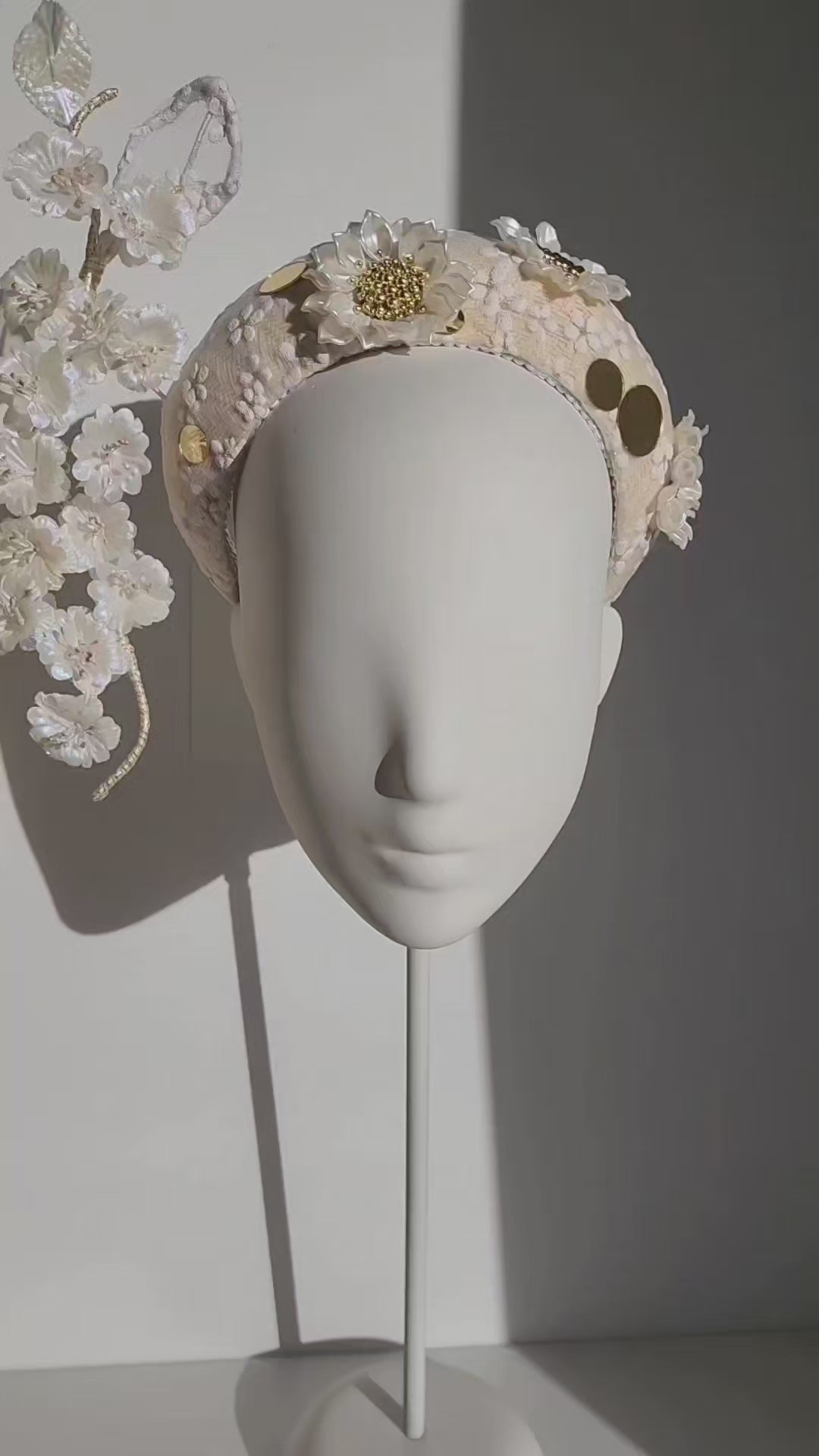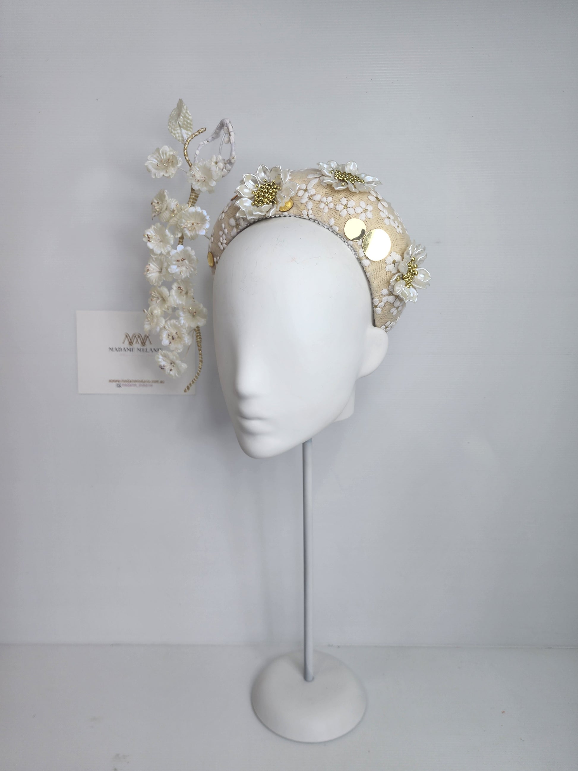 Mirrored Echoes features a hand blocked bandeau base, adorned with iridescent flowers and polka dot mirrors for a unique and eye-catching design. Perfect for adding a touch of shimmer and style to any outfit.