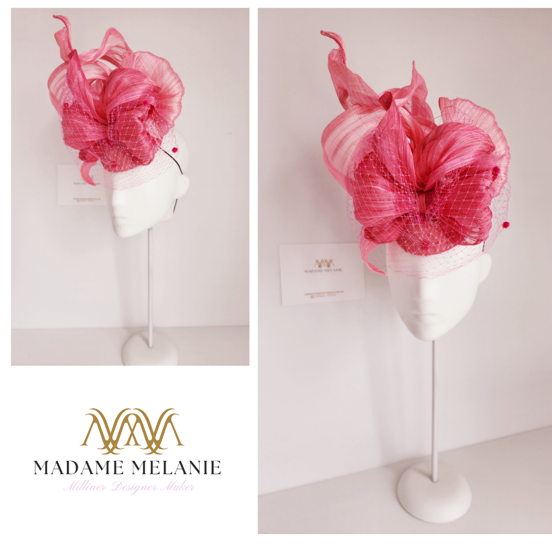 Elevate your look with Pink Caviar. With its pink hues, lightweight button base, and silk bows, this accessory adds a touch of elegance. The birdcage veiling adds a delicate, feminine touch. Perfect for your next Fashions on the field.