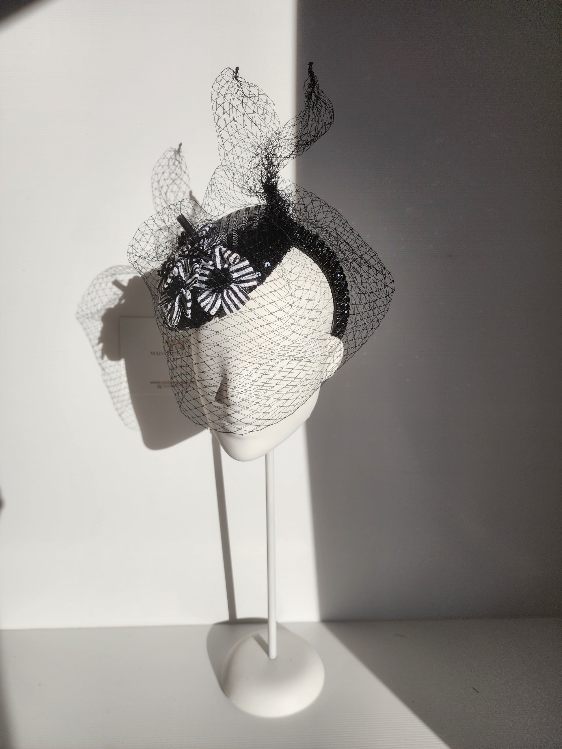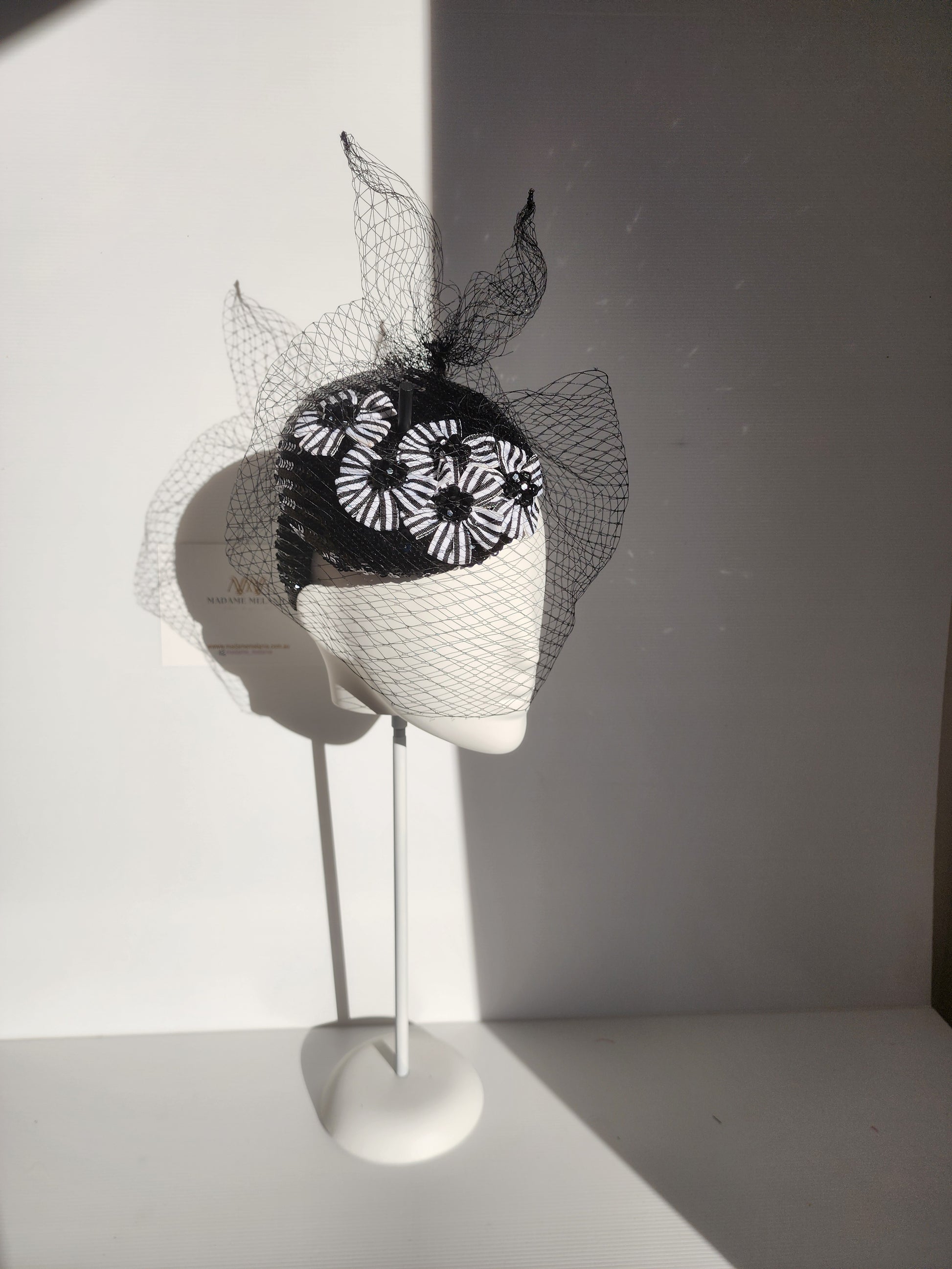 Screen Queen is a stylish beret featuring a unique button and sparkling sequin embellishments. The bold black and white flower design adds a touch of elegance, while the delicate birdcage veiling completes the look. Perfect for adding a touch of glamour to your outfit.