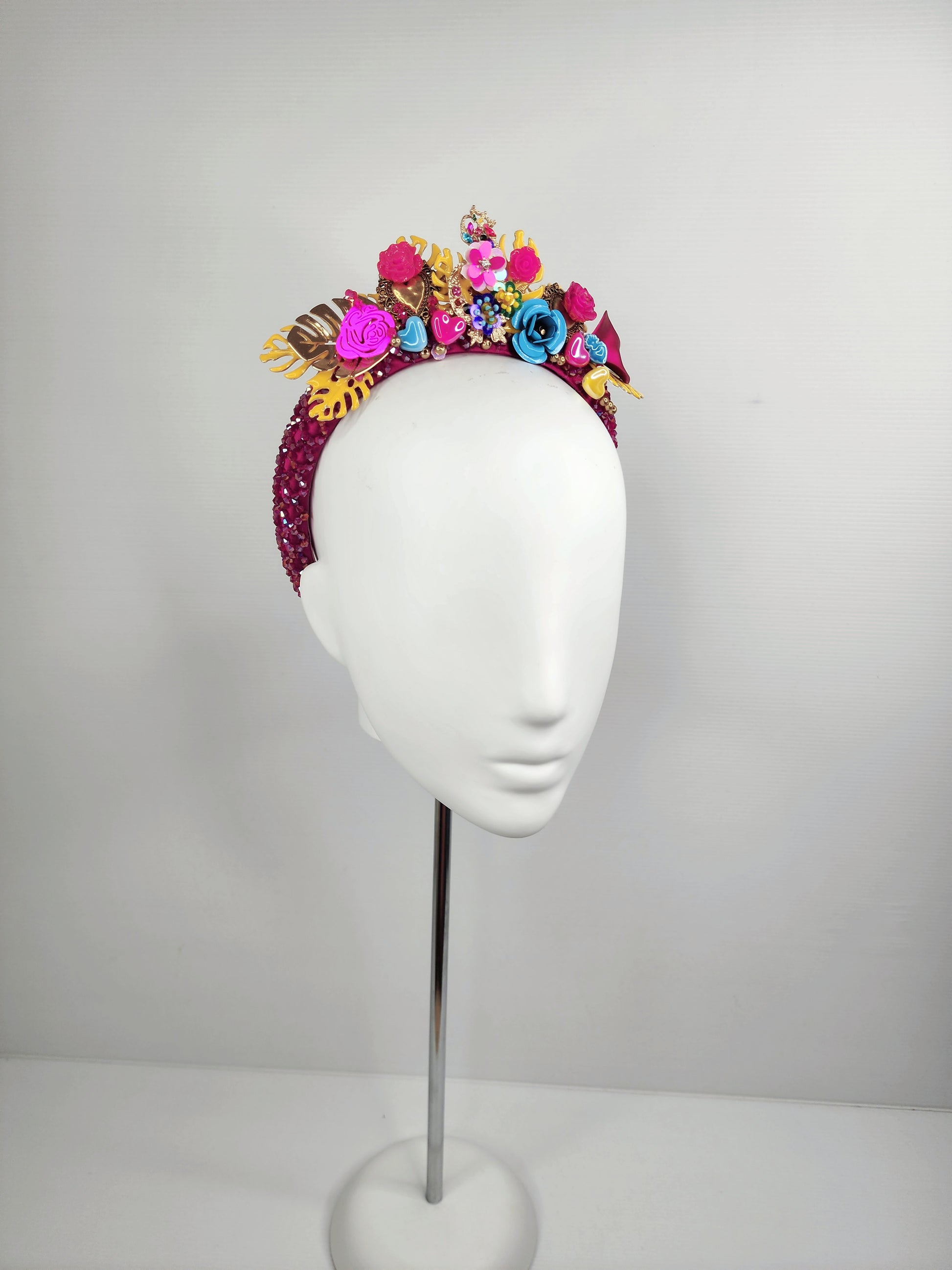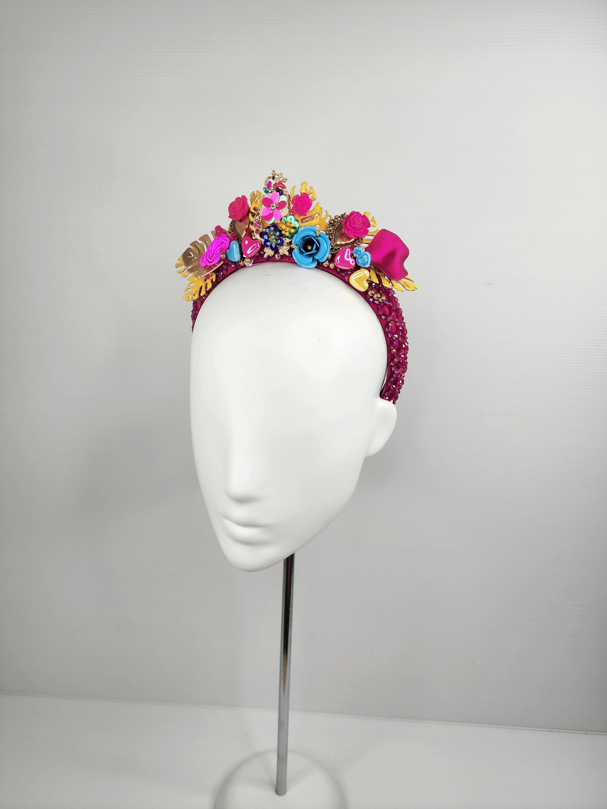 La vida Frida is a beautiful hand beaded crown, made with the utmost attention to detail by renowned headwear designer Madame Melanie in Australia. With its bright colors and intricate craftsmanship, each feature is hand sewn in place to create a bouquet of colourful design.